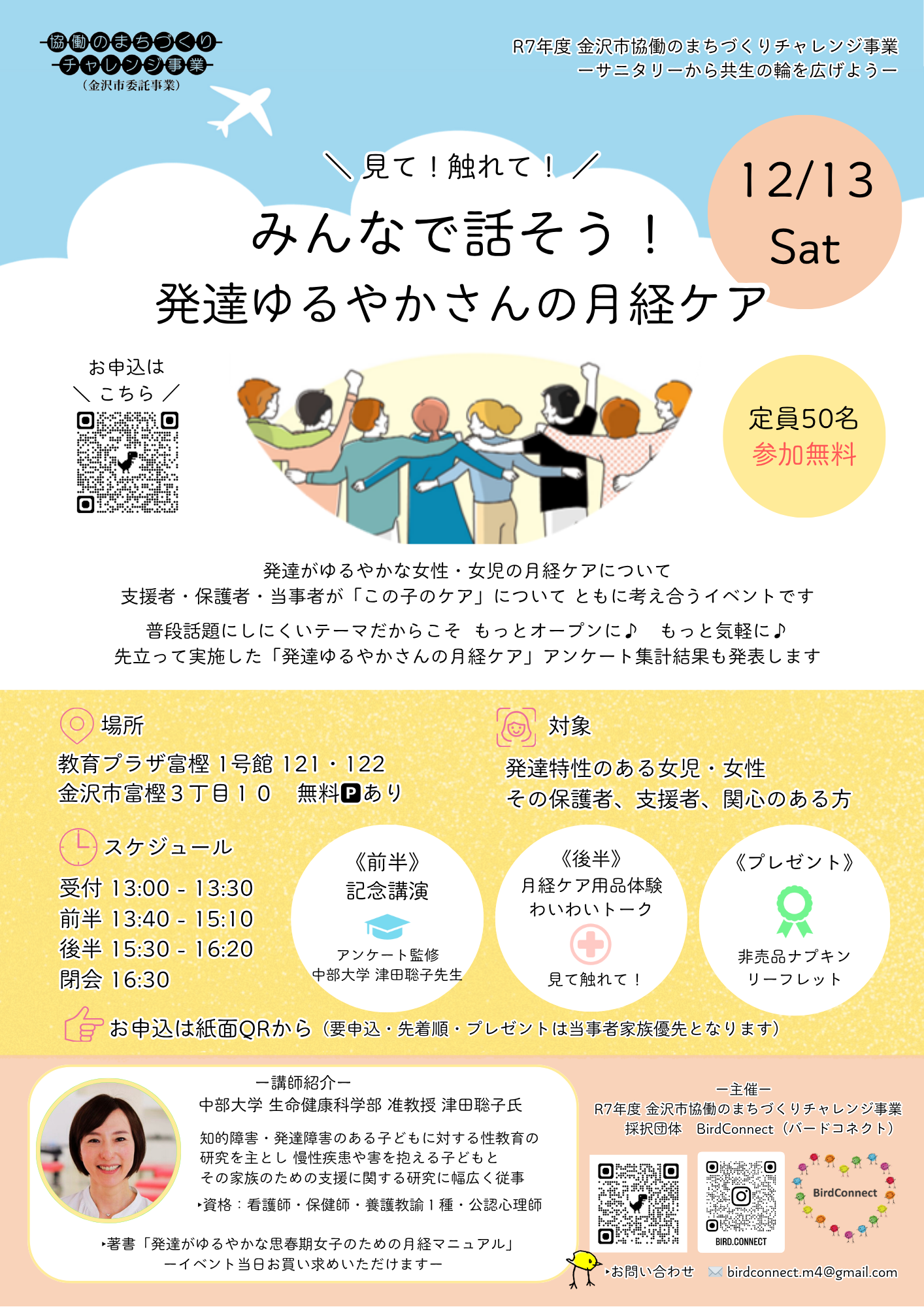 先立って実施している「発達ゆるやかさんの月経ケアアンケート」の集計結果の発表と専門家である中部大学津田聡子准教授の講演